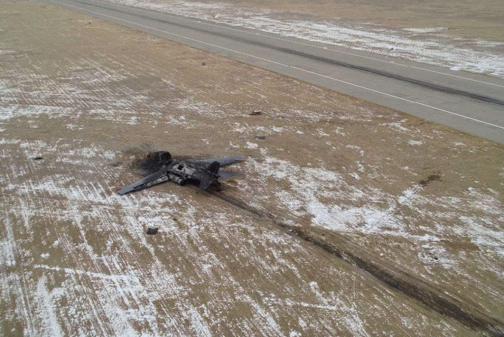 A heavily damaged B-1B that crashed at Ellsworth Air Force Base last night is seen sitting on a patch of grass next to the runway.
