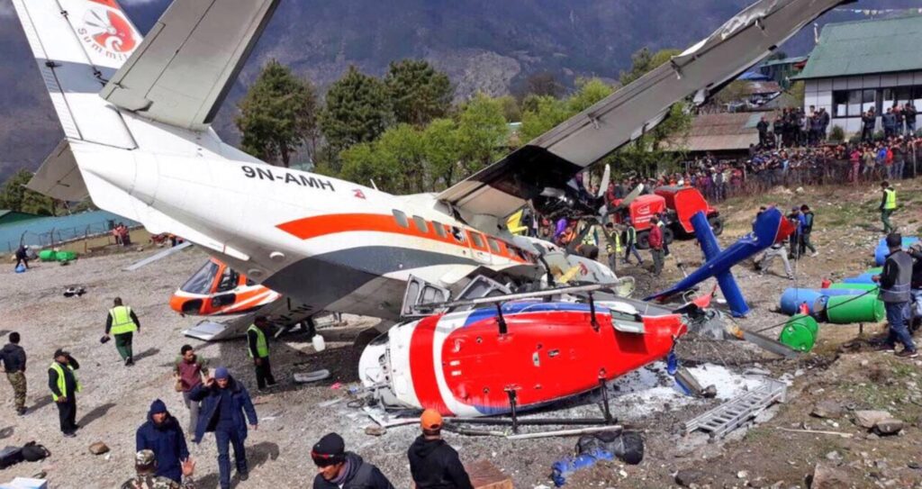 The aircraft crashed into the helicopter at Tenzing-Hillary Airport at Lukla, known as the gateway to the world’s highest mountain, 125 kilometres north-east of the capital, Kathmandu.