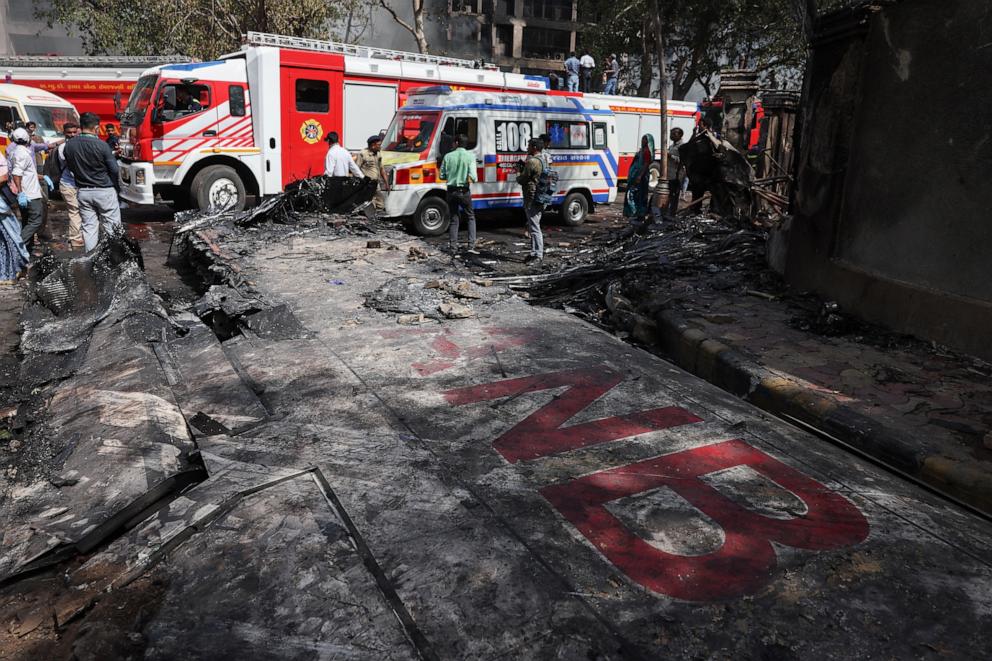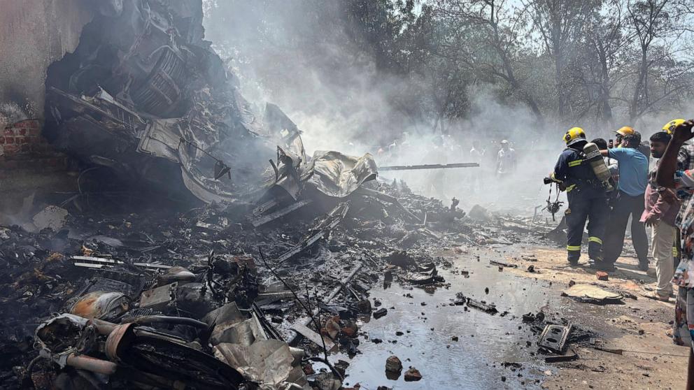 India’s Central Industrial Security Force released photos from the site of the crash, which appeared to include civilians and emergency personnel working to put out flaming wreckage. One photo appeared to show the damaged tail of the airplane resting partially inside a hole in a building.