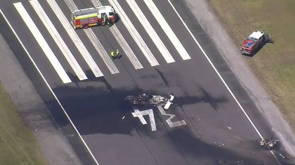 Photos from the scene show fire trucks on the runway dousing blackened debris with water and ambulance and police crews nearby. The plane appeared to be virtually destroyed, with the tail the only part of the plane not burnt out.