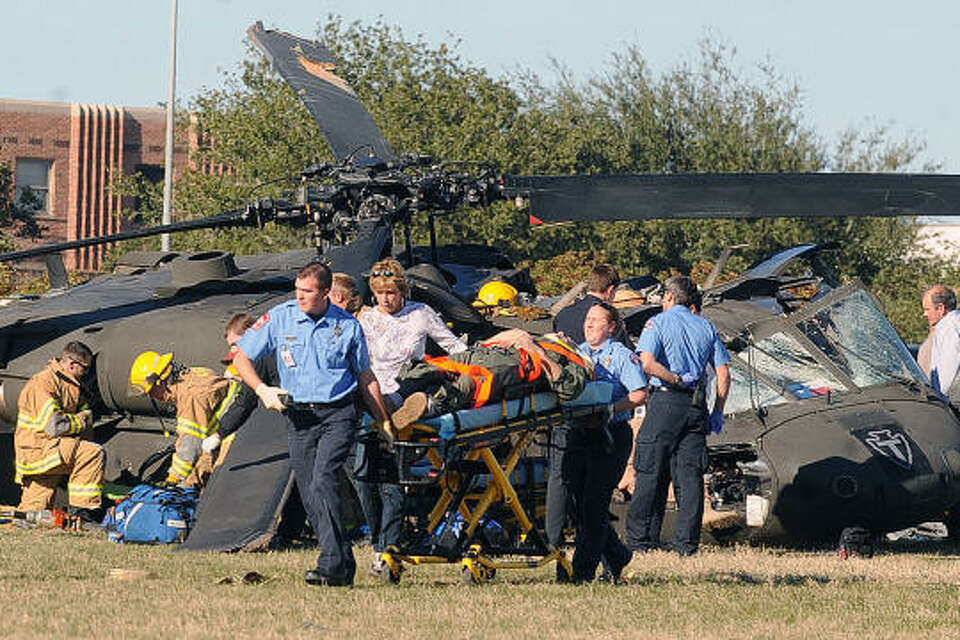 An Army helicopter taking part in a training exercise crashed Monday into a field on the campus of Texas A&M University. One crew member was killed and four others were hospitalized, authorities said.