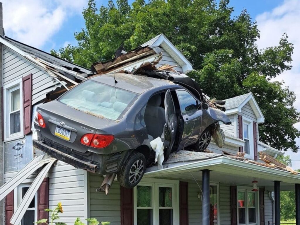 The Corolla, which has Pennsylvania plates, sits atop a lower roof over the front porch of the home as the front of the car is smashed into a now-crooked dormer with large splinterings of wood littering the roof and lawn below in one of the images.