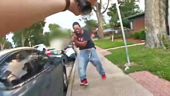 Cole moves quickly around a parked car toward the other officer, raising his hands to chest level, but what he is holding isn’t clear in the video. She fires her handgun at him, and he collapses on the sidewalk.