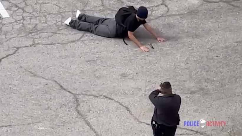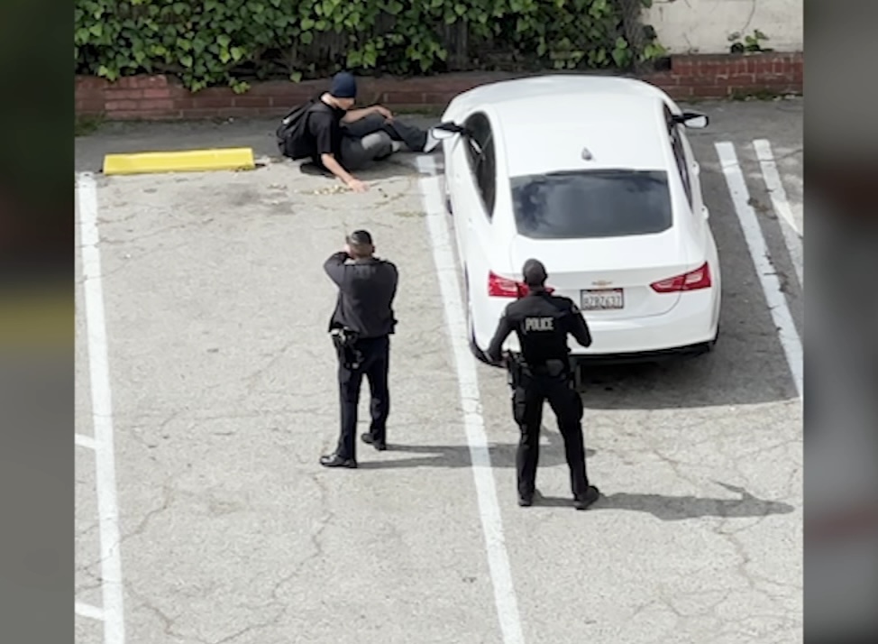 The footage shows the man crouching near the car as two officers approach on foot, one of them with his gun drawn. The suspect briefly sits on the ground as the officers apparently issue commands.
