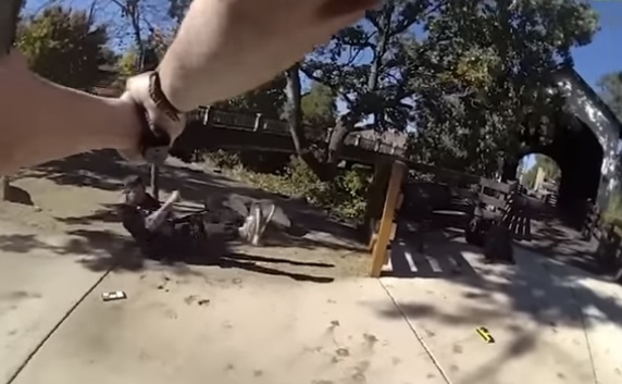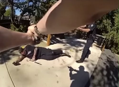 While on the ground, the suspect ignored commands, grabbed the knife again, and began to stand. Both officers then fired their weapons.