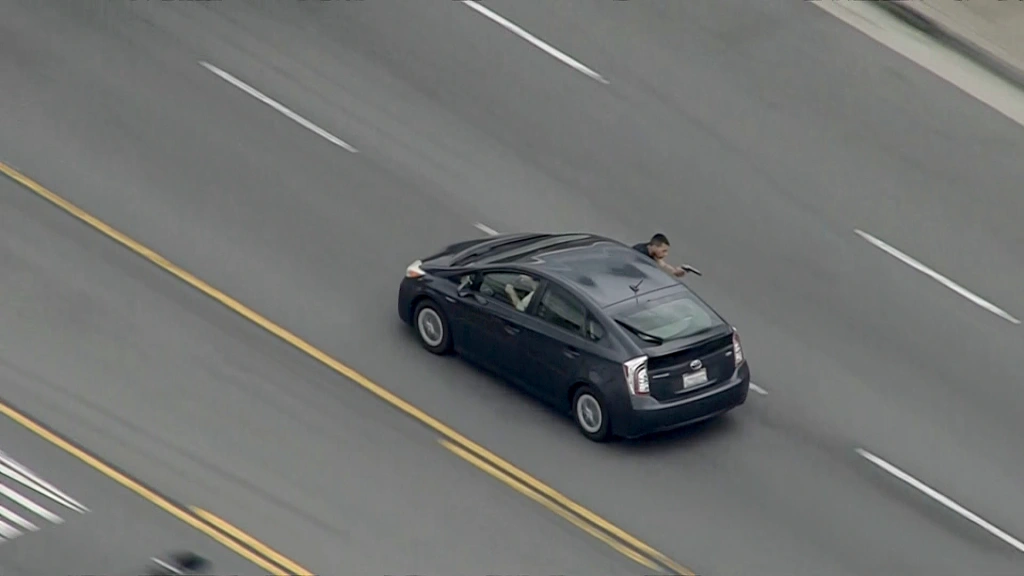 During the pursuit, an NBC Los Angeles aerial camera showed a male passenger in the Prius leaning out the window and firing with the large, silver handgun as motorists were caught between authorities and the gunman.