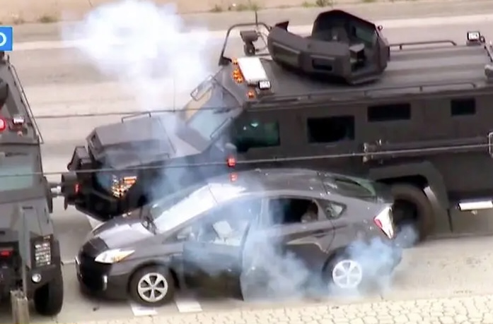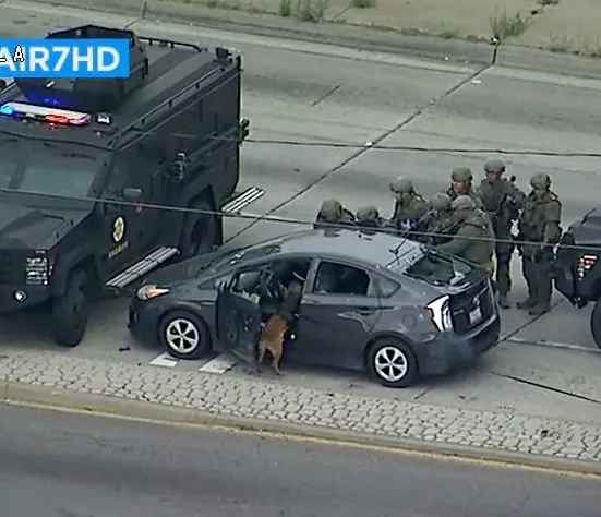 Los Angeles Sheriff’s Department SWAT team members appeared to use stun grenades to roust the unresponsive suspect, but after sending in a police dog and creeping up behind the Prius by using the cover of an armored vehicle, deputies extracted the man.