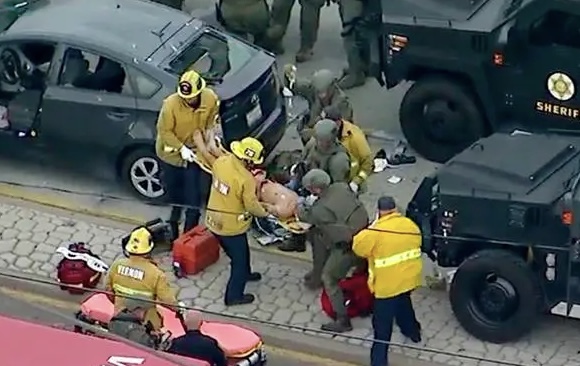 Law enforcement officers returned fire at the end of the relatively short pursuit, which ended in an industrial area southeast of downtown L.A.