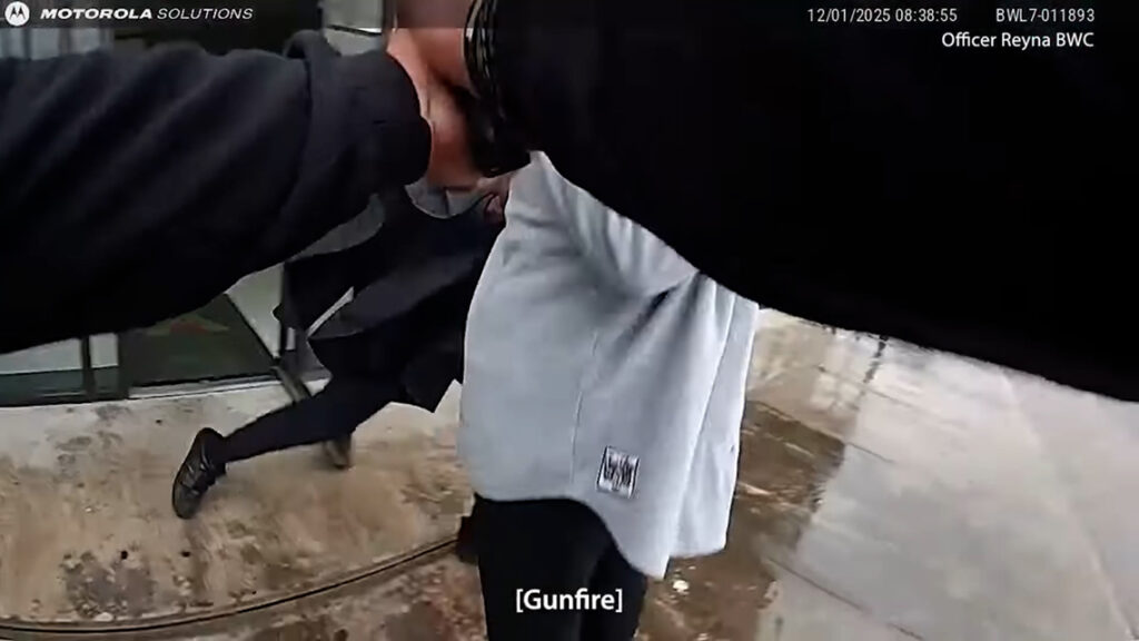 The body camera footage shows the officer arriving within four minutes to find the store locked. Inside, a female employee can be seen walking toward the front door with a man in a hooded black poncho following closely behind.