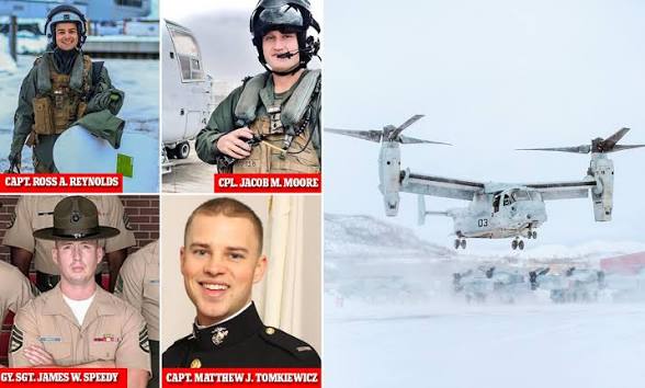 The Norwegian government confirmed the four crew members’ bodies were retrieved Sunday. The Marines then identified the deceased as Capt. Matthew J. Tomkiewicz, 27, of Fort Wayne, Indiana; Capt. Ross A. Reynolds, 27, of Leominster, Massachusetts; Gunnery Sgt. James W. Speedy, 30, of Cambridge, Ohio and Cpl. Jacob M. Moore, 24, of Catlettsburg, Kentucky.