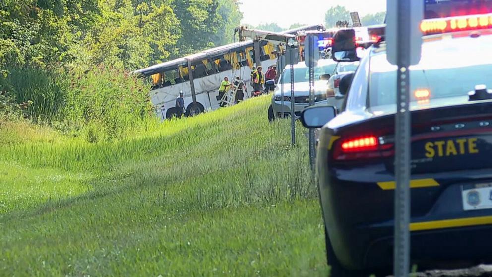 Police initially said the collision also involved a semi-truck, though later said the bus was the only vehicle involved.