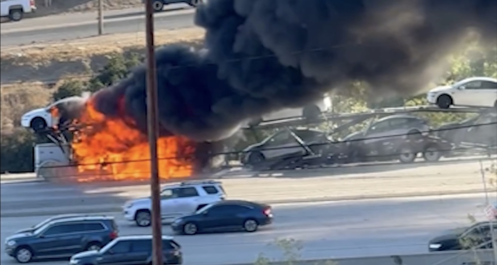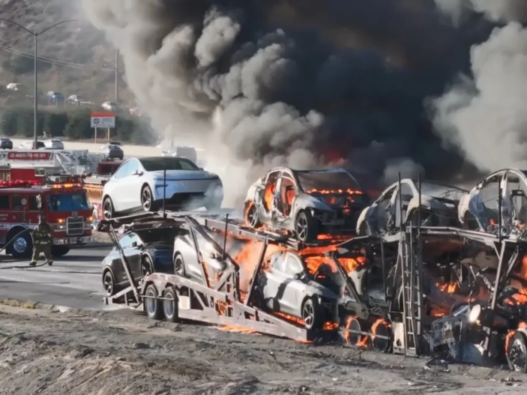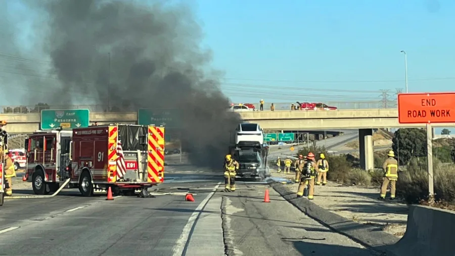 Car-carrier truck loaded with Teslas causes hazmat fire on 5 Freeway in Sylmar