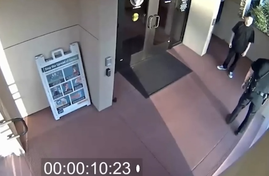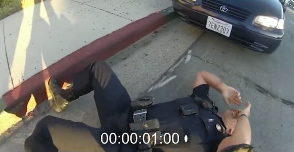 The video shows the suspect with little warning or provocation pull a handgun from his waist and shoot an officer twice, hitting him in the body before another officer returned fire, striking the suspect with three of her five rounds.