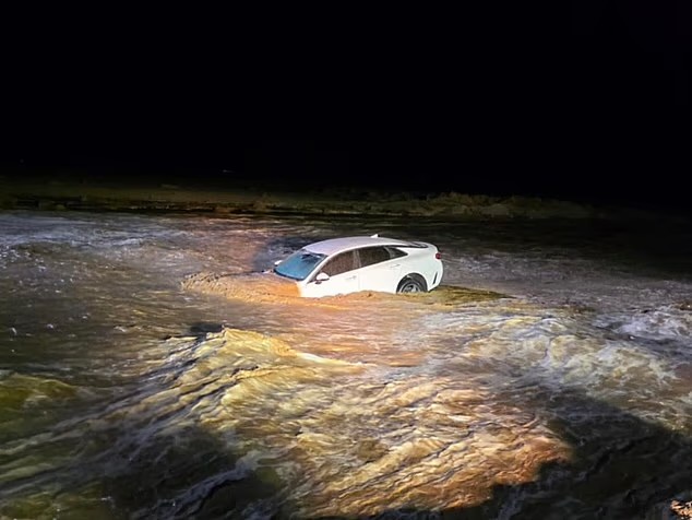 Xavier Padilla Aguilera, 2, was with his father, 26-year-old Brandon Padilla Aguilera, when the dangerous waters swept the family’s white sedan away around 7.14pm in Barstow.