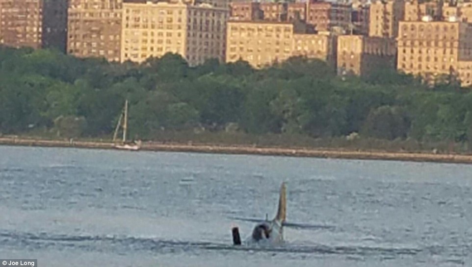 The plane was hoisted onto a barge (pictured) and taken to a heliport in lower Manhattan, where investigators from the Federal Aviation Administration and the National Transportation Safety Board will examine it to determine what caused the crash