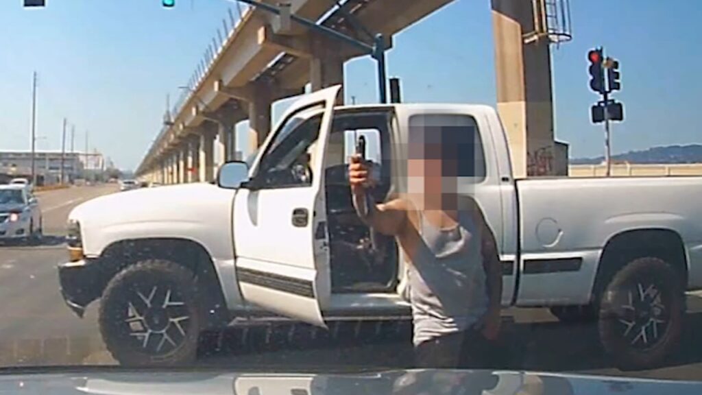 Dashcam video recorded in East Oakland shows a driver approaching the intersection of 98th and San Leandro Street. He has a green light but a man driving a white pickup truck goes through the red light and into the intersection. There is honking. The driver blocks the intersection and the man in that pickup gets out, points a gun at the other driver, and opens fire as the vehicle goes by — something that left a bullet hole in the side of the vehicle.