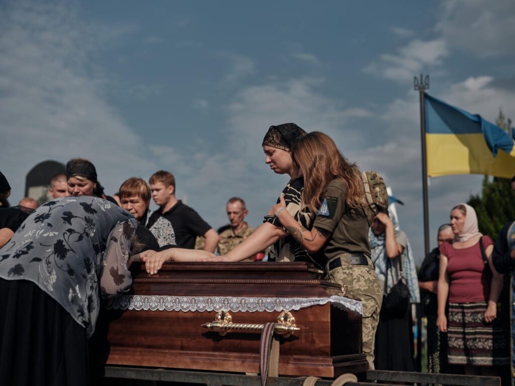 In a scene from Oleksiy Mes’s Aug. 29 funeral in Shepetivka, Ukraine, a woman leans over his coffin while another reaches across it to hold her hand, as a younger woman clutches the second woman from behind.