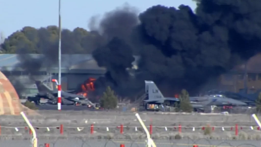 The two-seat F-16 jet “lost power” as it took off from the base near the southeastern city of Albacete and crashed into an area where other planes were parked, damaging five other aircraft, the defence ministry said in a statement.