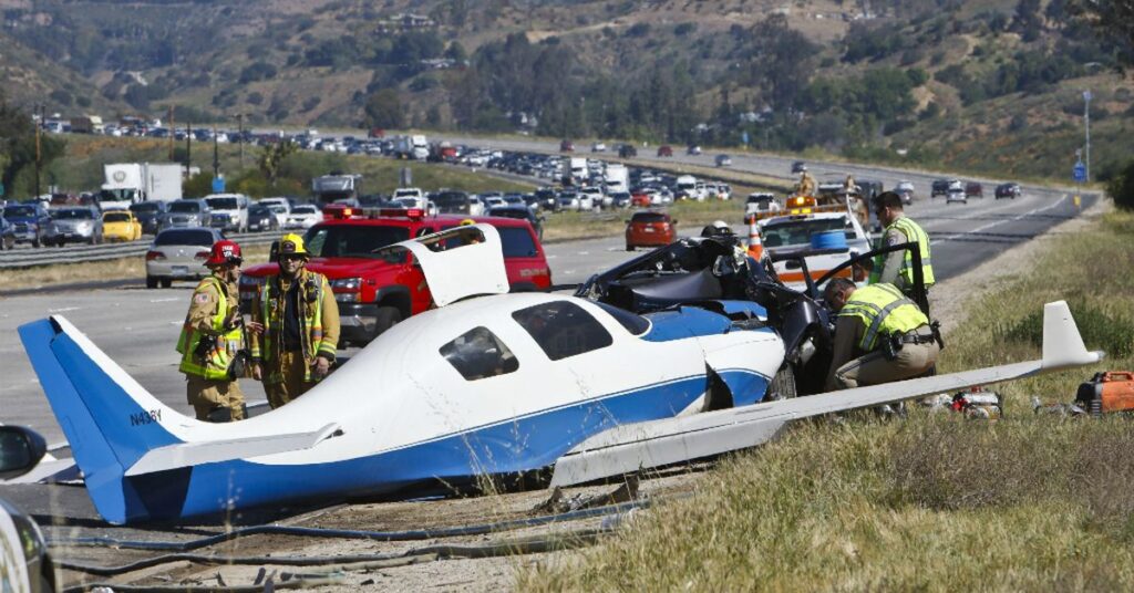 Five others, including the pilot and his passenger, were injured in the crash on a stretch of the freeway that has been the scene of several plane landings.