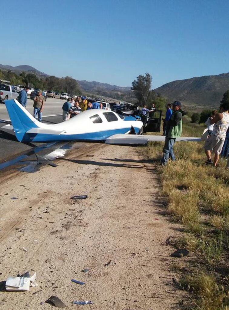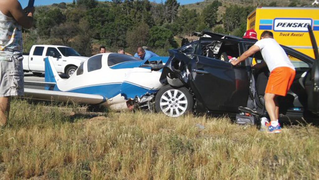 The Lancair IV landed on its belly and skidded about 250 feet before striking the rear of a black Nissan Altima sedan that was stopped on the shoulder in San Diego County near Fallbrook. The driver of the car had pulled over to synchronize the Bluetooth device on his phone, Parent said.