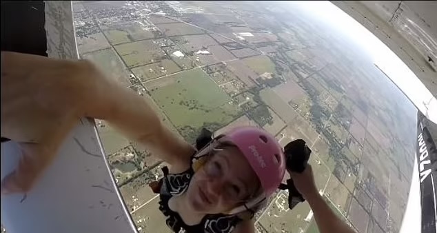 She posted a video of herself jumping from a plane with the caption: ‘This was my first solo jump!! I’m in love.’
