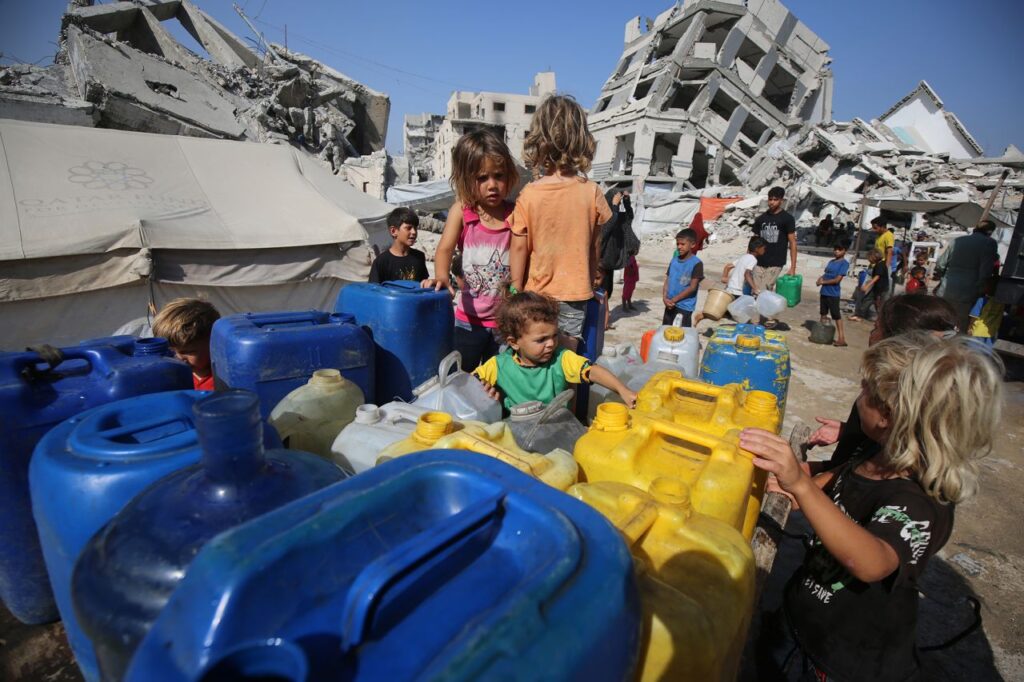 Displaced Palestinians in Gaza City fill cans with water delivered by tankers on July 17. With key infrastructure destroyed, UN agencies have warned that hundreds of thousands of people have little access to water or hygiene