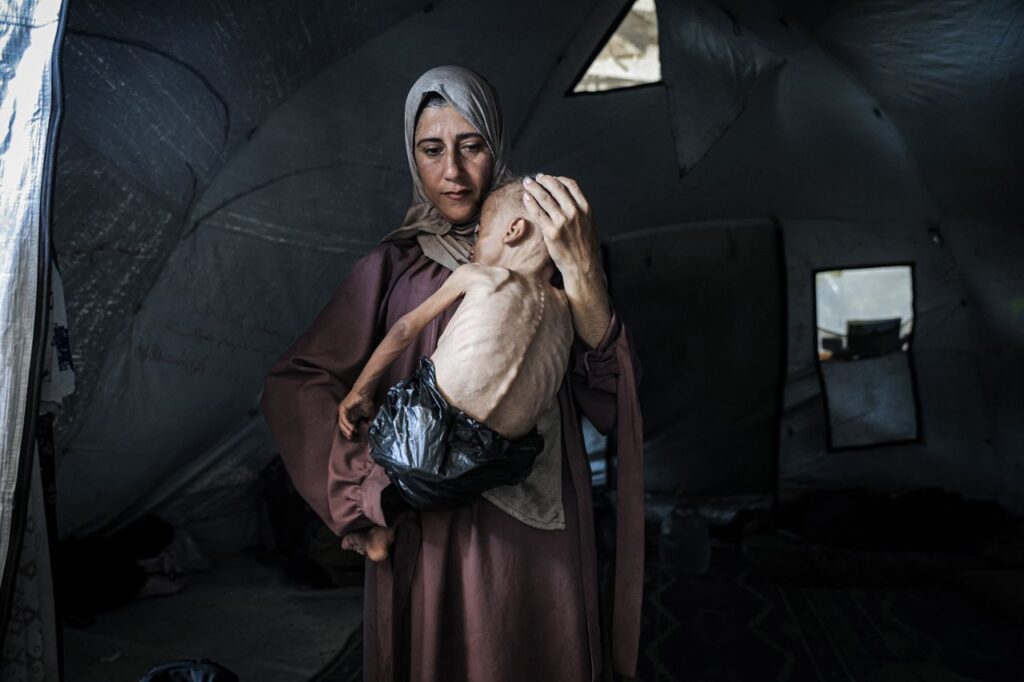 A 1.5-year-old child in Gaza City, Muhammad Zakariya Ayyoub al-Matouq, faces life-threatening malnutrition as the humanitarian situation worsens due to ongoing Israeli attacks and blockade, on Monday. Having dropped from 9 to 6 kilograms, he struggles to survive in a tent.