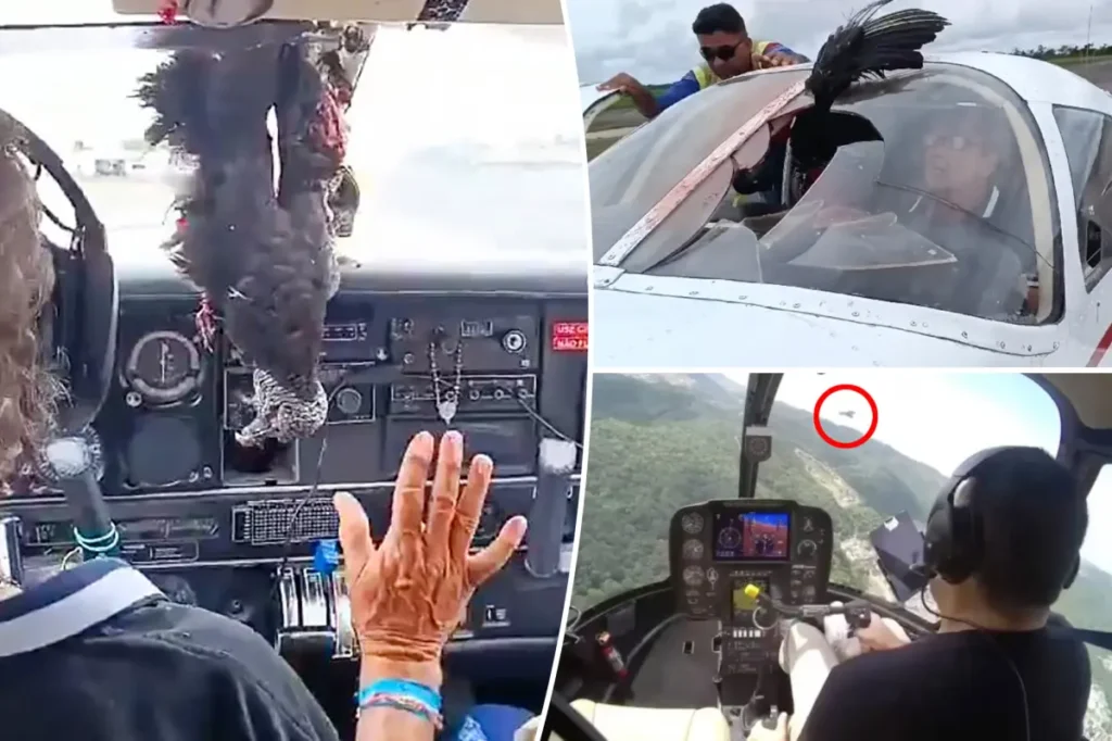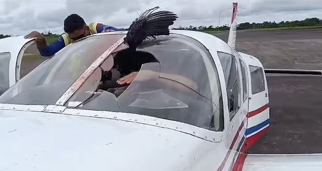 This is the moment a vulture crashed into a plane’s cockpit, forcing the pilot to perform an emergency landing with the dead bird hanging in front of him.