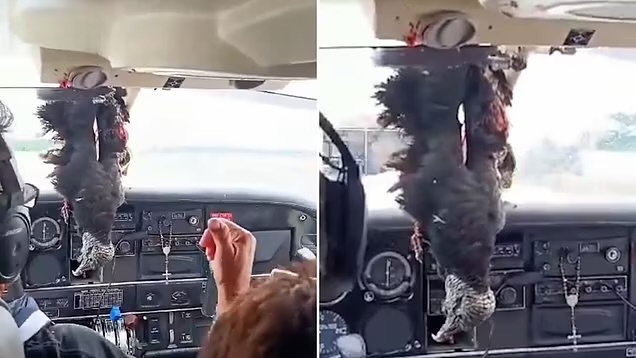 Footage taken mid-flight on the plane showed the dead bird’s carcass, covered in blood and ruffled feathers, hanging by its feet from the top of the windshield.