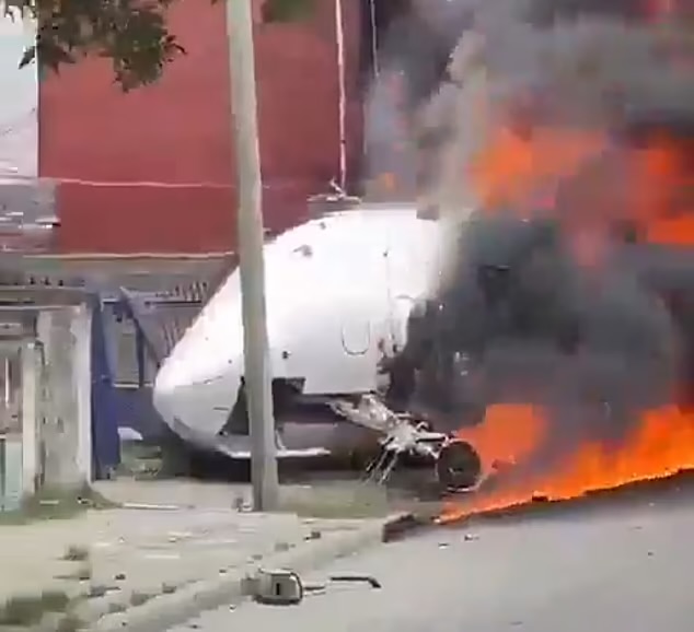 Cellphone video filmed by a bystander showed residents keeping their distance from the burning jet and a wrecked vehicle.