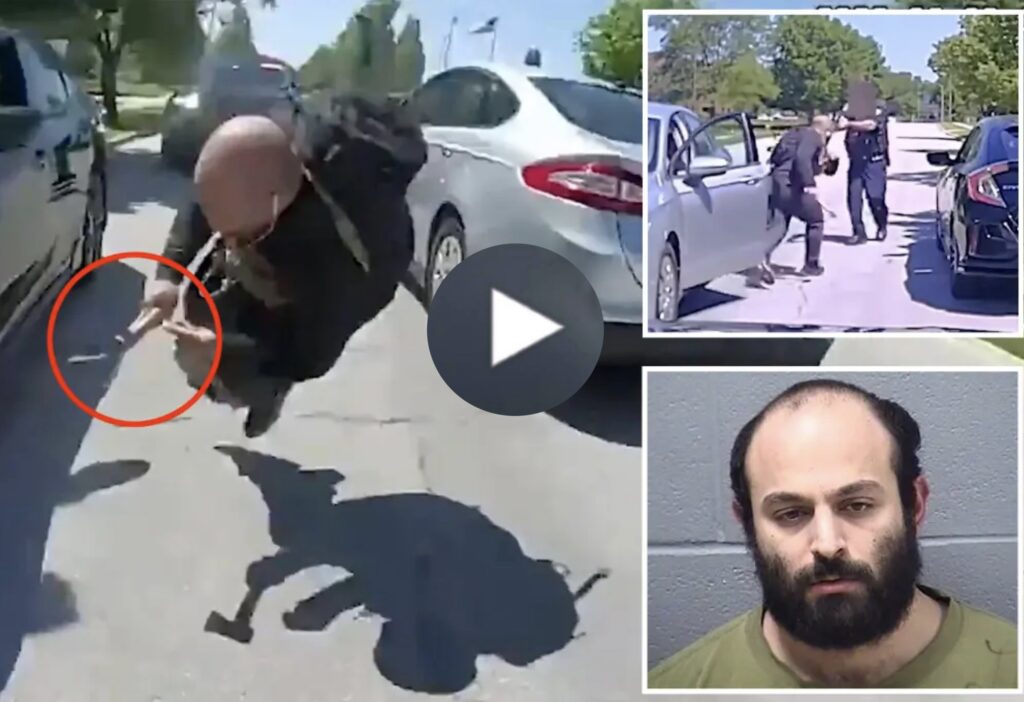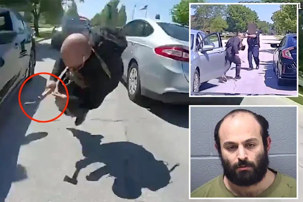 Naperville police released an image from the officer’s bodycam showing the confrontation and the hatchet in the suspect’s hand.