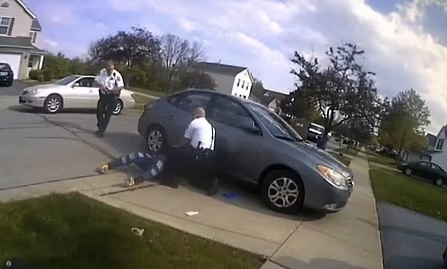 The 10-second clip begins with the officer getting out of his car at a house where police had been dispatched after someone called 911 saying they were being physically threatened, Interim Police Chief Michael Woods said at the news conference. The officer takes a few steps toward a group of people in the driveway when Bryant starts swinging a knife wildly at another girl or woman, who falls backward. The officer shouts several times to get down.