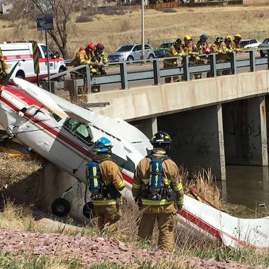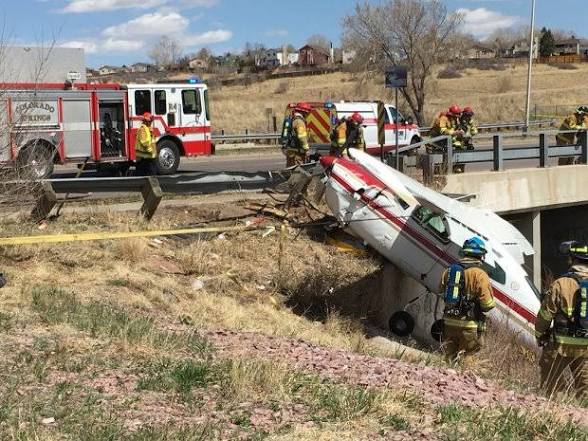 The Cessna 210 went down on Constitution Avenue east of Powers near Tutt Boulevard, and according to police, flipped over a guardrail.
