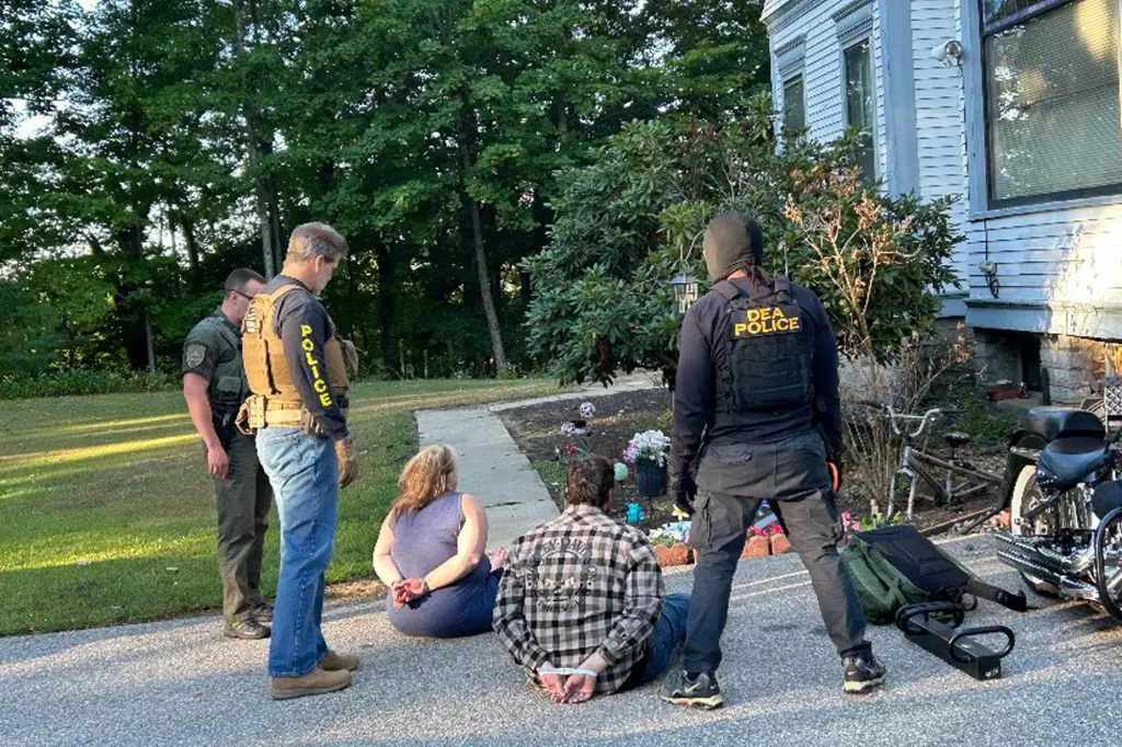 DEA officers detain two suspects outside a Franklin, N.H., residence during a fentanyl trafficking raid on Aug. 27, 2025