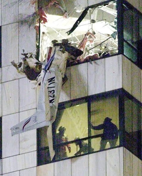 Though terrorism was quickly discounted, the televised image of a plane blasting a hole in the side of a skyscraper was a chilling reminder of the World Trade Center attacks. The plane’s tail dangled near the 28th floor of the 42-story Bank of America building.