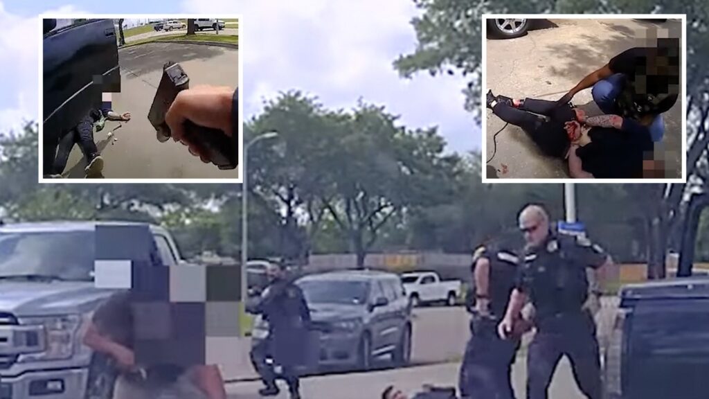 Various camera angles show how the shooting unfolded through footage from the Houston Police Department (HPD) officers’ body-worn cameras and the dash-cam footage from their vehicle. Officer J. Sallee and his partner, Officer M. McMurtry, are seen approaching the suspect’s vehicle after making the traffic stop.