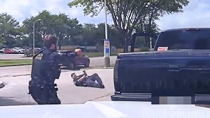 Shocking video footage has been released by police of the moment a traffic stop in Texas unexpectedly turned into a three-man gunfight between two police officers and a suspect.