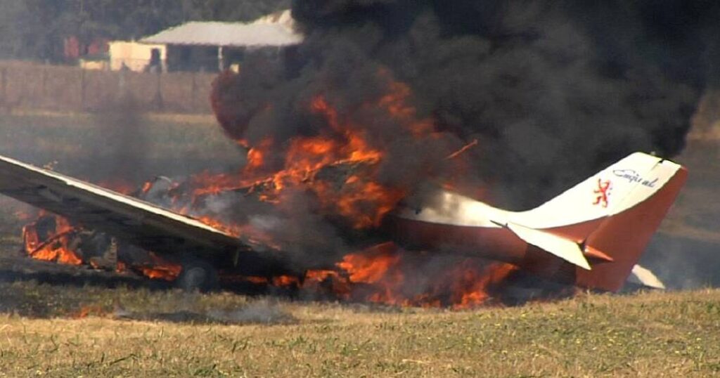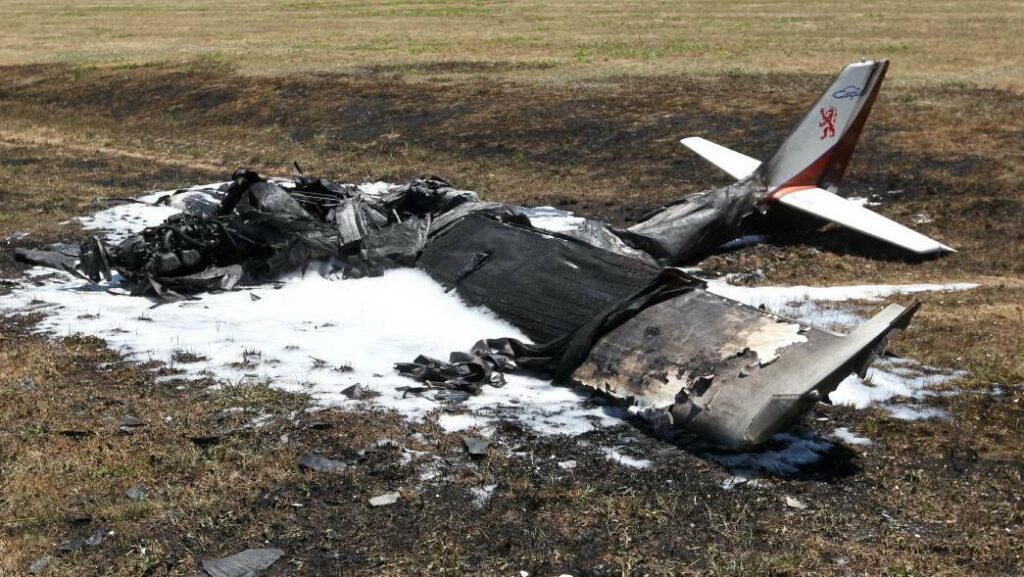 Both occupants of the plane were able to walk away before the aircraft burst into flames and was destroyed, along with a section of grass