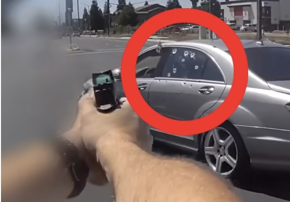 He then fired a round into her car, police said. Slowed down footage appears to show him holding a gun out the window and a bullet hole is visible on the rear driver’s side window.