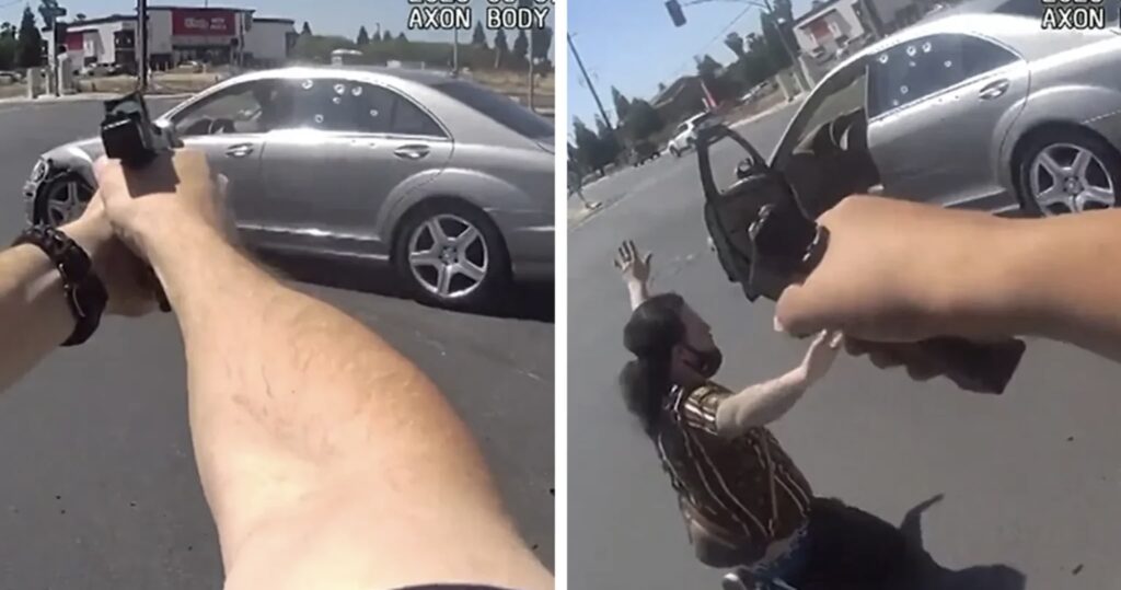 A sergeant in the area saw the cars in the pursuit going west on Jensen and he headed to the incident, video shows. As the woman stops behind other cars in a left turn lane at Elm Avenue, the officer stops behind her while the man is stopped on the passenger’s side.
