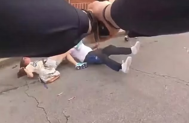 ‘Get down, get down,’ Rutherford screamed multiple times while pointing his gun toward Moorehead who then jumped on top of the woman and appeared to put the knife to her face.